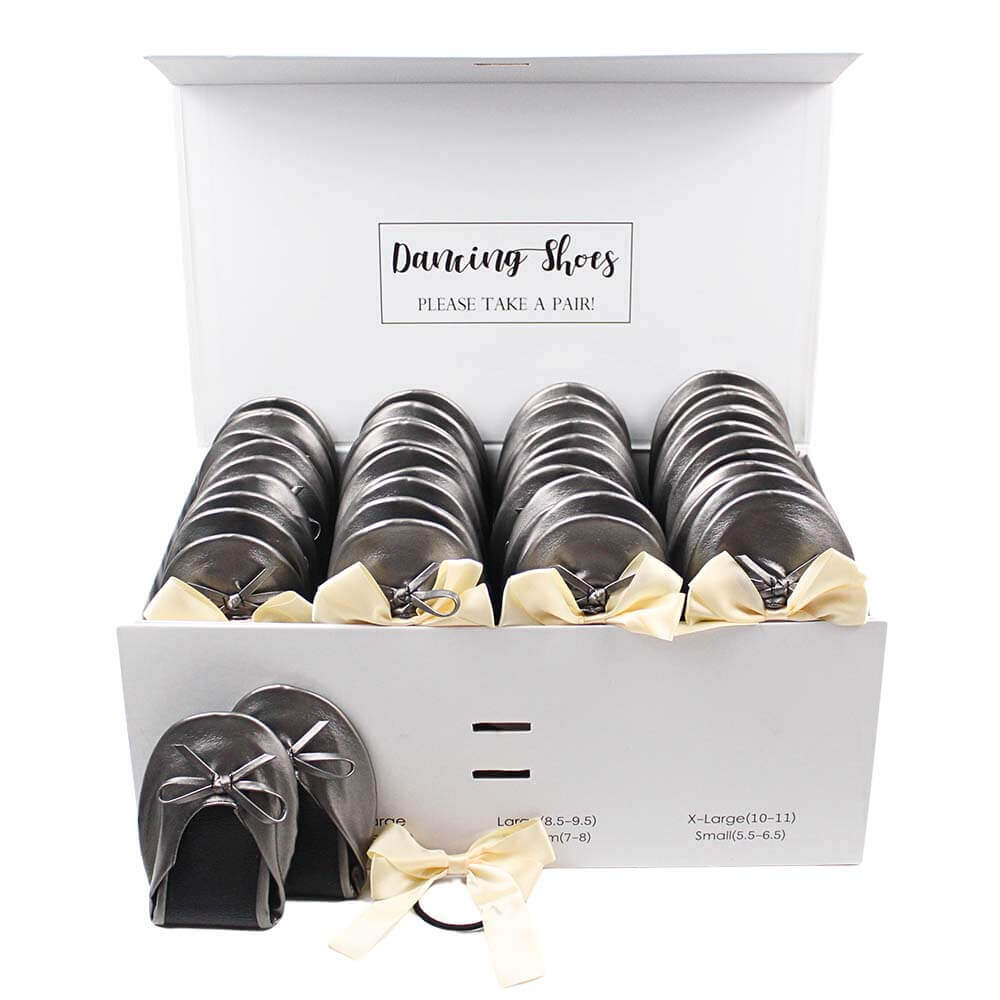 Lumos Blue® Grey Wedding Guest Shoes Box Sets come with 24 pairs of ballet flats for women, ranging from small to x-large. Each pair of Lumos Blue foldable ballerina flats includes a beige hair bow. Your wedding guests will also receive a drawstring heel bag to store their pretty stilettos, then they will feel free to dance all night!