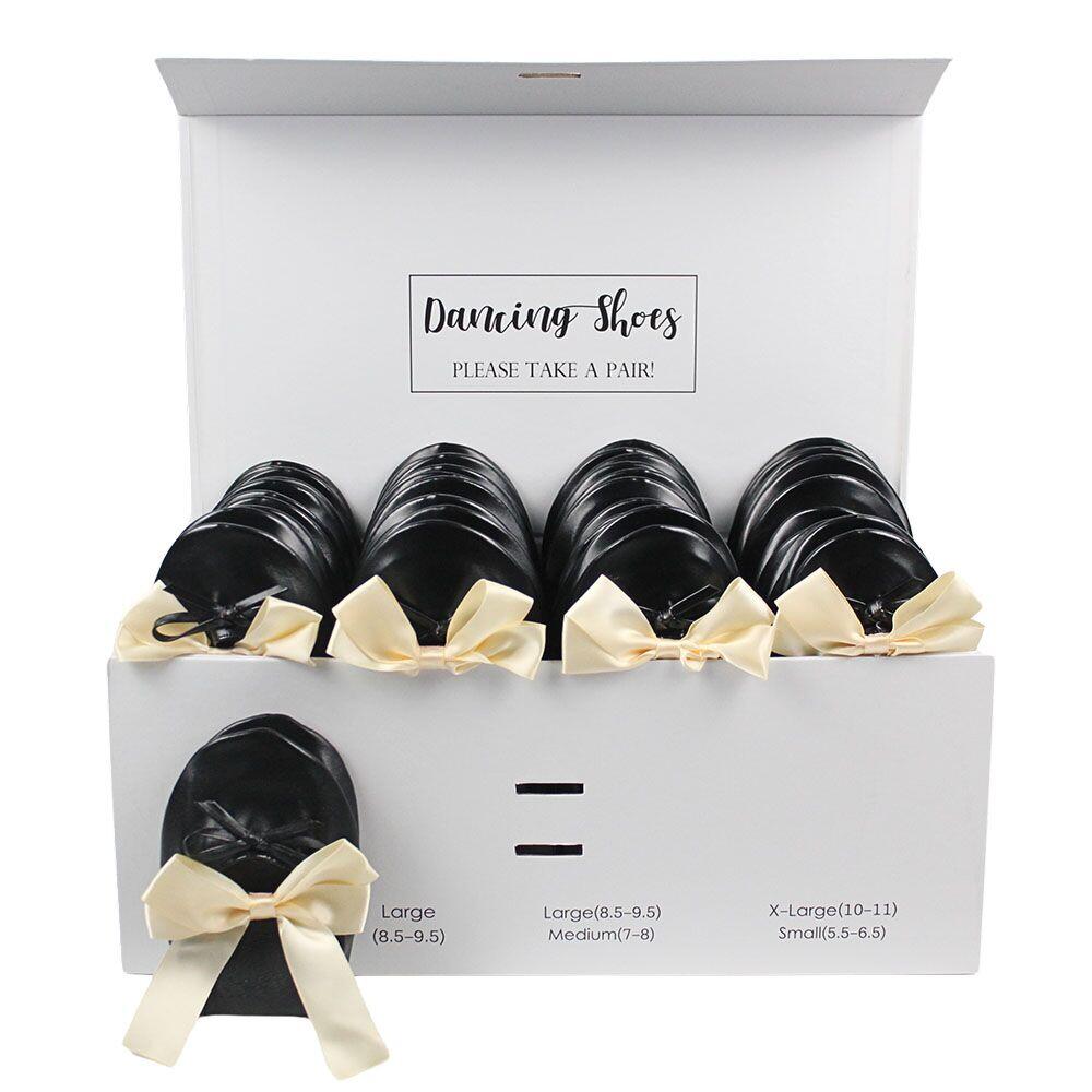 24 Pairs of Black Flats Shoes for Wedding Box Set is a perfect option as a bridal shower gift and wedding favor, with a stylish design to keep your guests dancing all night long!