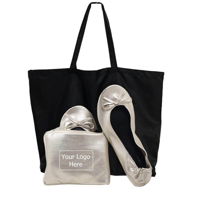 Custom/personalized Foldable Ballet Flats for bridesmaids’ gifts, wedding favors, home slippers, dancing flats, sorority gifts, and trade show gifts.