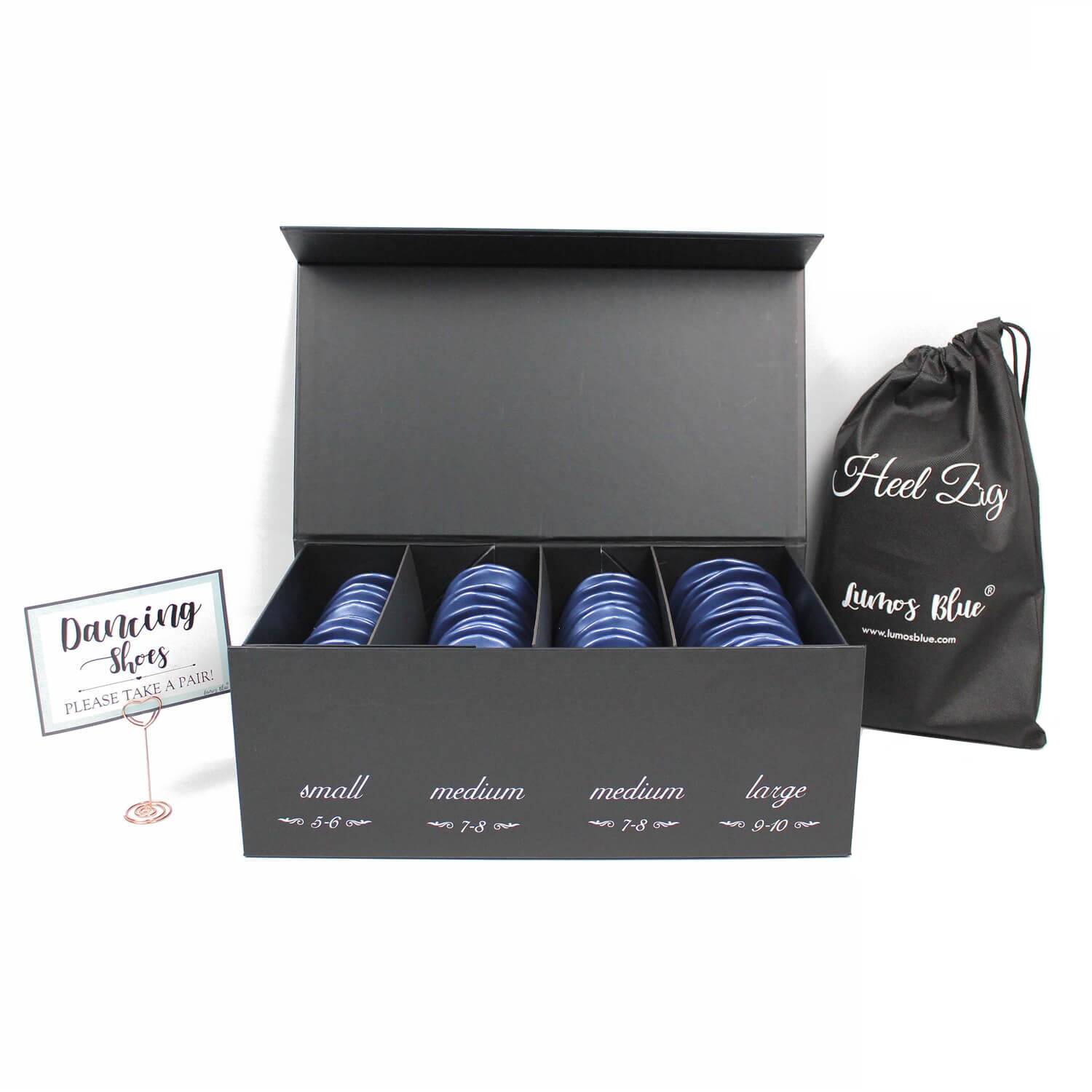 Lumos Blue Bulk Foldable Ballet Flats Box Sets come with 24 pairs of foldable ballet flat,s ranging from small to large. Each pair of Lumos Blue foldable ballerina flats includes a daisy hair tie. Your wedding guests will also receive a drawstring heel bag to store their pretty stilettos, then they will feel free to dance all night!