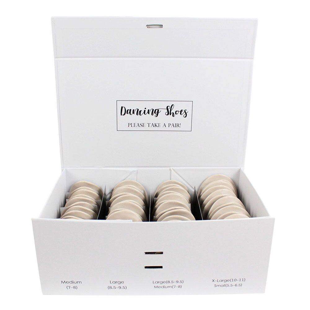 Our recommendation is to have 1 box set of foldable ballet flats for every 60 wedding guests.