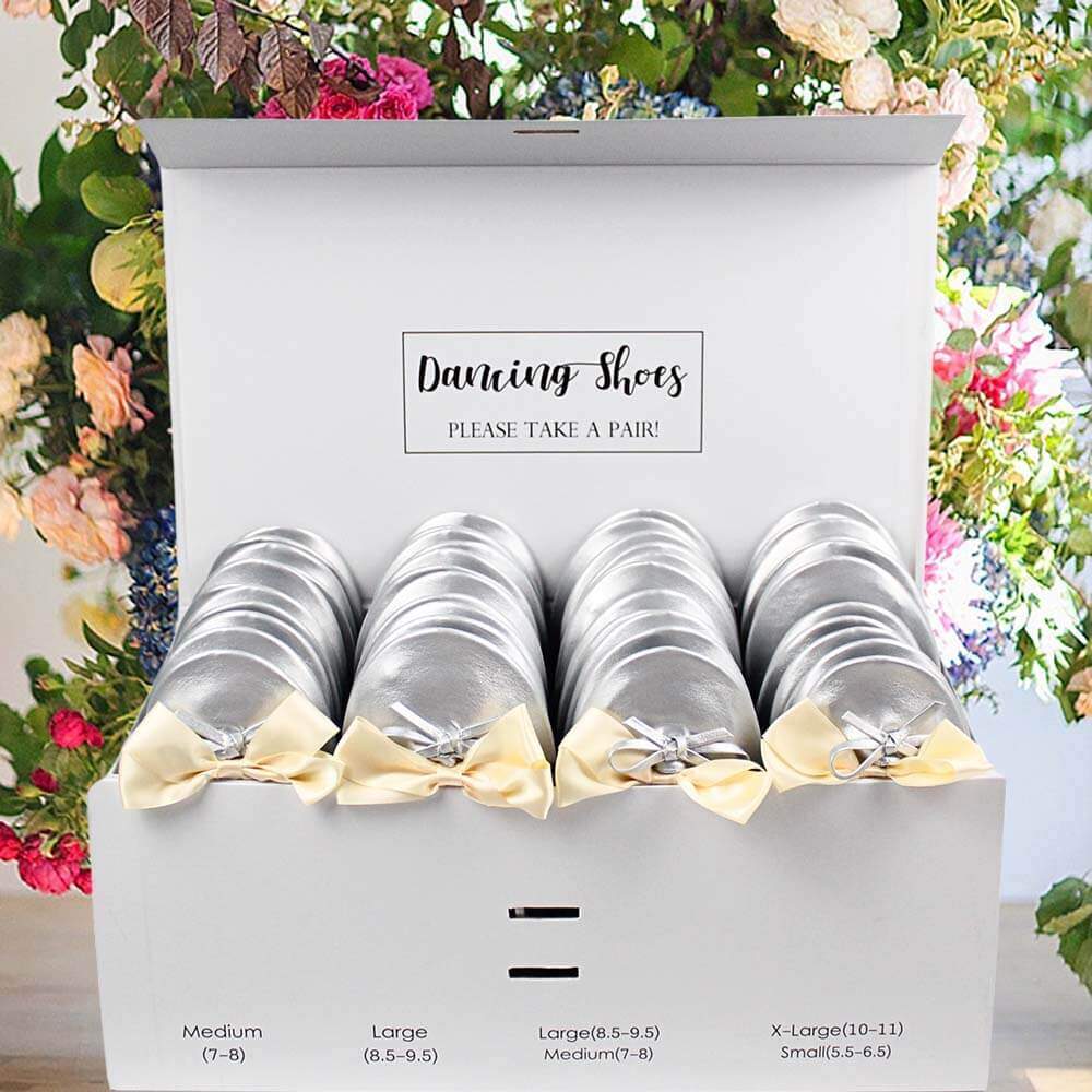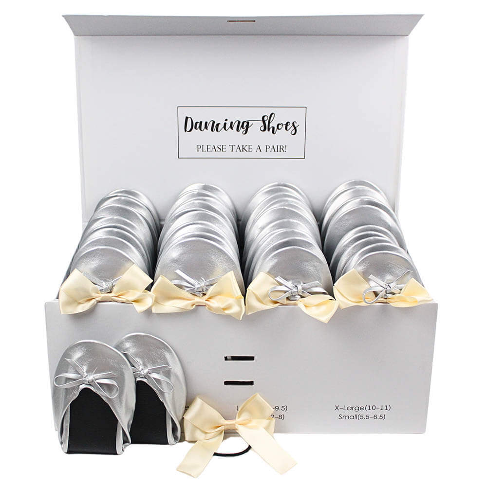 24 Pairs of Silver Wedding Ballet Slippers Box Set is a perfect option as a bridal shower gift and wedding favor, with a stylish design to keep your guests dancing all night long!